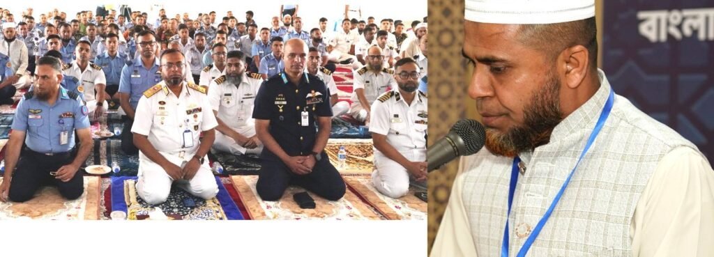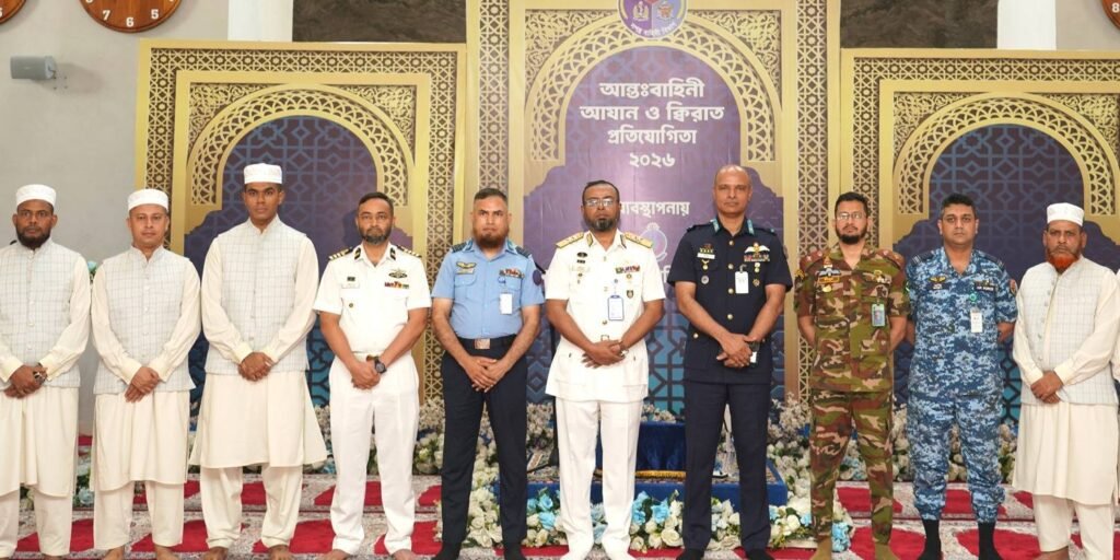 Dhaka, 13 April 2026 – The Inter-Services Azan and Qirat Competition 2026 commenced today at the Shaheen Mosque of BAF Base Bashar in Dhaka under the supervision of the Bangladesh Air Force. The competition was formally inaugurated by Assistant Chief of Naval Staff (Logistics), Rear Admiral Md. Shafiqur Rahman, who attended the opening ceremony as the chief guest. A total of 36 participants from the Bangladesh Army, Bangladesh Navy, and Bangladesh Air Force are taking part in the competition. On the opening day, the Qirat segment of the contest was held, showcasing the recitation skills of the participants. Senior military officials from the three services, along with other members, were present at the event. The competition will conclude on April 15, 2026, with a closing and prize distribution ceremony.