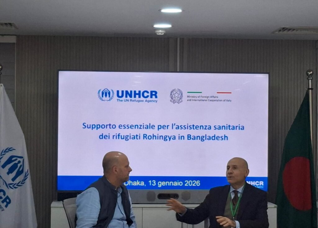 Dhaka, 14 January 2026 – UNHCR, the UN Refugee Agency, has welcomed a contribution of EUR 1 million (equivalent to USD 1.2 million) from the Government of Italy to support life-saving healthcare services for Rohingya refugees in Bangladesh. The funding, provided by Farnesina, Italy’s Ministry of Foreign Affairs and International Cooperation, and its Directorate General for Migration Policies, will help UNHCR and its partners sustain essential health services in the refugee camps. These include primary healthcare, emergency referrals, maternal and child health services, and disease prevention, ensuring continued access to critical care in one of the world’s largest and most complex humanitarian settings. UNHCR said the contribution reflects Italy’s commitment made at the Global Refugee Forum (GRF) to support the protection and empowerment of Rohingya refugees and promote their peaceful coexistence with host communities in Bangladesh.